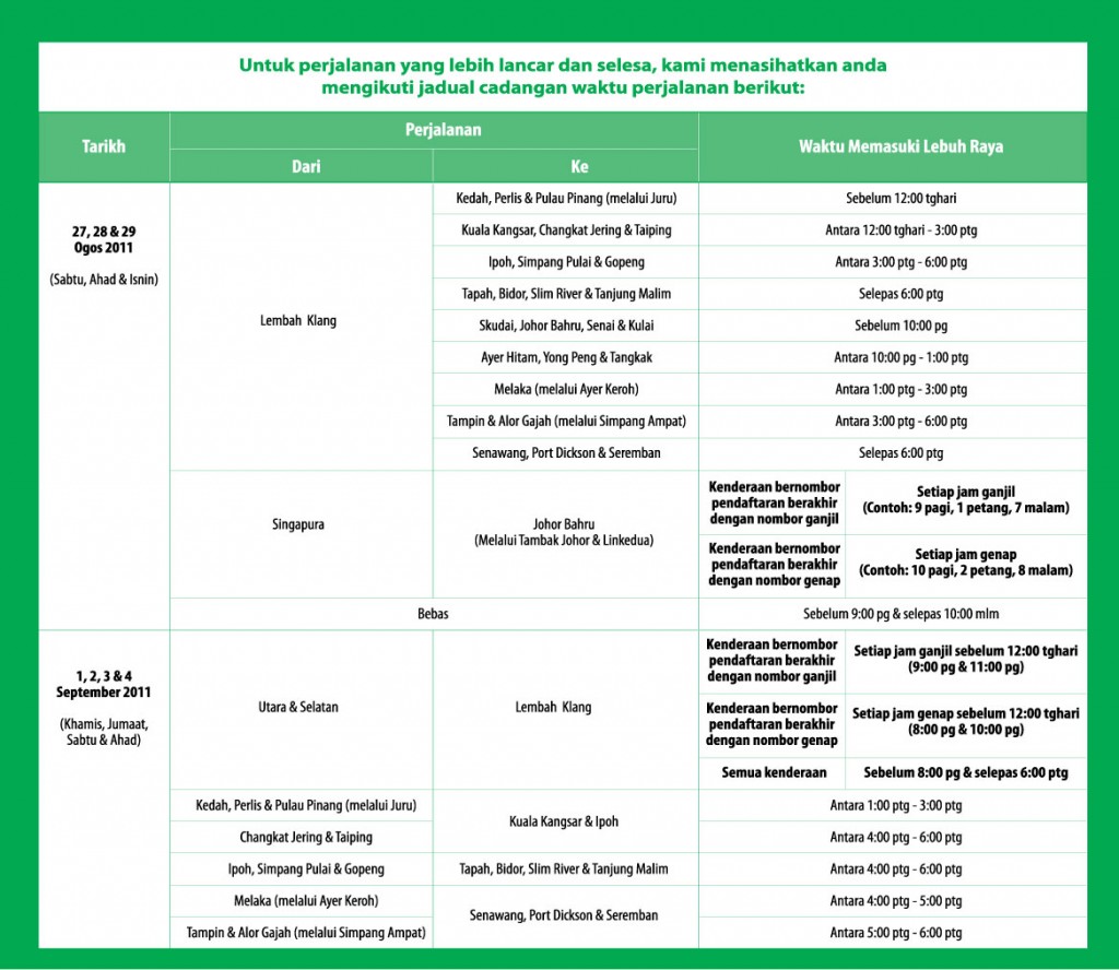 PLUS Expressways Bhd (PLUS) memperkenalkan jadual perjalanan dengan membahagikan kenderaan bernombor pendaftaran berakhir dengan nombor ganjil dan genap bagi melancarkan perjalanan di lebuh raya sempena musim cuti Aidilfitri dan Hari Kemerdekaan. Langkah itu bertujuan memisahkan kumpulan pengguna lebuh raya dari utara dan selatan termasuk mereka ingin pulang berhari raya pada saat-saat akhir menuju ke Lembah[Read More]